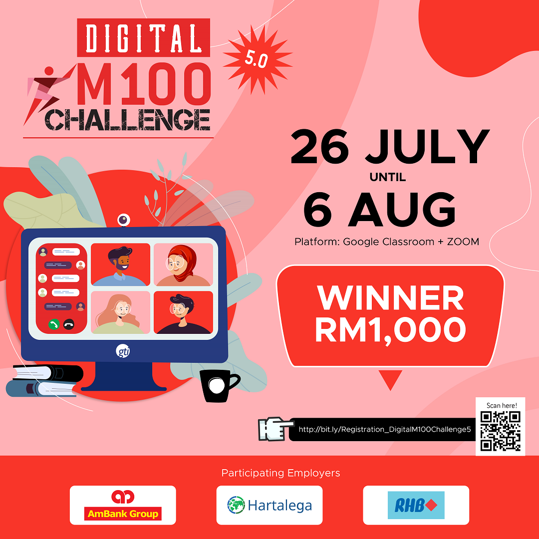 Our Digital M100 Challenge 5.0 is back for another round of brainy challenges that will put your teamwork, skills, and creativity to the test! Grab yourself a partner and complete a series of fun and fruitful activities from our participating employers. Don't hold back your potential, show us what you got! Please note that participants from past Digital M100 Challenge rounds are not allowed to participate. Students can sign up by scanning our QR code or register at http://bit.ly/Registration_