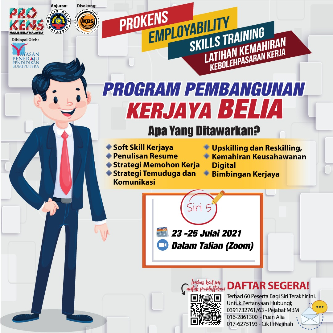 Majlis Belia Malaysia (MBM) telah melaksanakan PROKENS: Program Latihan Kemahiran Kebolehpasaran Kerja. Program ini disokong oleh Kementerian Belia dan Sukan Malaysia (KBS) dan dibiayai oleh Yayasan Peneraju Pendidikan Bumiputera. Program ini adalah percuma dan berbaki satu siri sahaja lagi pada tarikh 23-25 Julai 2021 melalui dalam talian dengan menggunakan aplikasi Zoom.