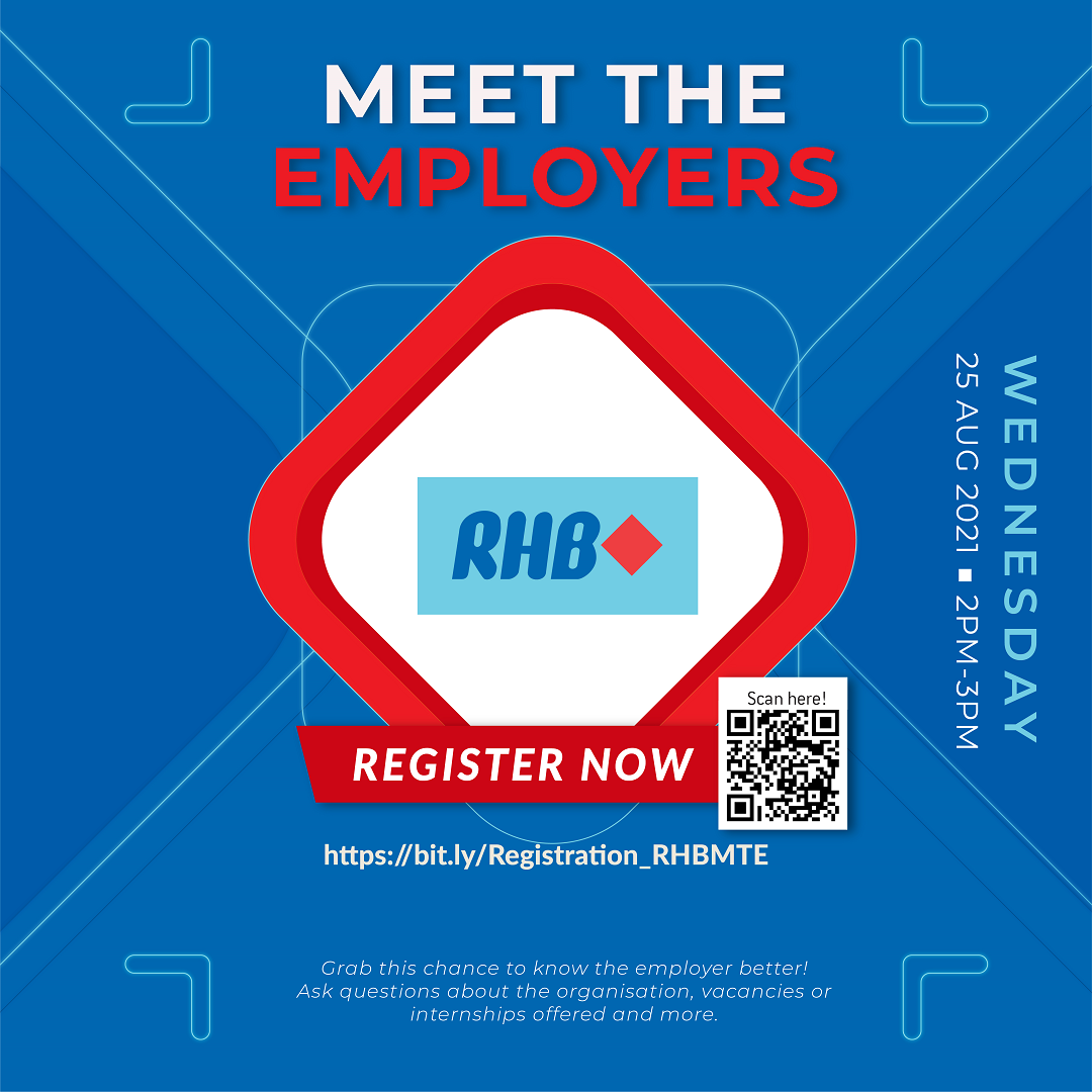 RHB Banking Group offers great programmes like their RHB Graduate Programme and Internship Programme for aspiring candidates like yourself, aiming to build your career within the banking and finance industry. There are plenty of job opportunities available for fresh graduates and experienced professionals too! Understand more about RHB at our 'Meet The Employer' event! Registrations are open! Use this link: https://bit.ly/Registration_