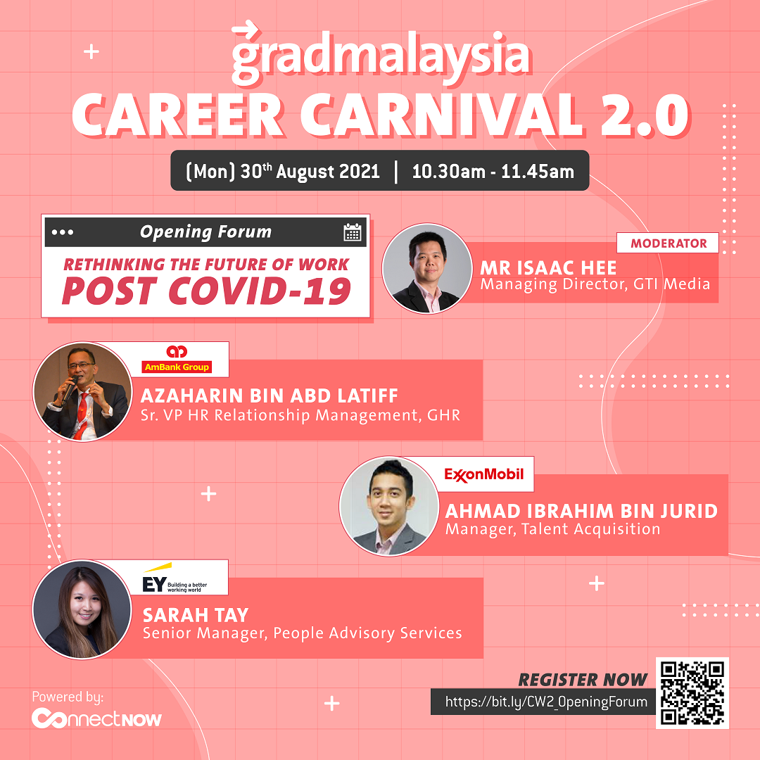And to start off the event, you are all invited to the gradmalaysia Career Carnival 2.0 Opening Forum, “Rethinking The future of work post COVID-19” this coming Monday, 30th of August from 10.30 AM – 11.45 AM. Moderated by GTI Media’s Managing Director, Mr Isaac Hee, he will be joined by Mr Azaharin Abdul Latiff from AmBank Group Malaysia, Mr Ahmad Ibrahim Jurid of ExxonMobil and Ms Sarah Tay of EY Malaysia.
