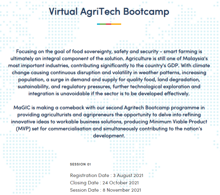 MaGIC is making a comeback with our second Agritech Bootcamp programme in providing agriculturists and agripreneurs the opportunity to delve into refining innovative ideas to workable business solutions, producing Minimum Viable Product (MVP) set for commercialisation and simultaneously contributing to the nation’s development.