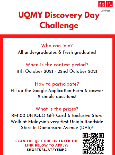 UNIQLO Malaysia is excited to share the UNIQLO Discovery Day Challenge! Winners of this challenge will be invited to join us for an exclusive store walk in UNIQLO Malaysia’s very first Roadside Store – UNIQLO Damansara Avenue Square! This unique opportunity will allow winners to have a better insight of our upcoming UNIQLO Manager Candidate (UMC) Program and what are the skills essential to run a successful store business.