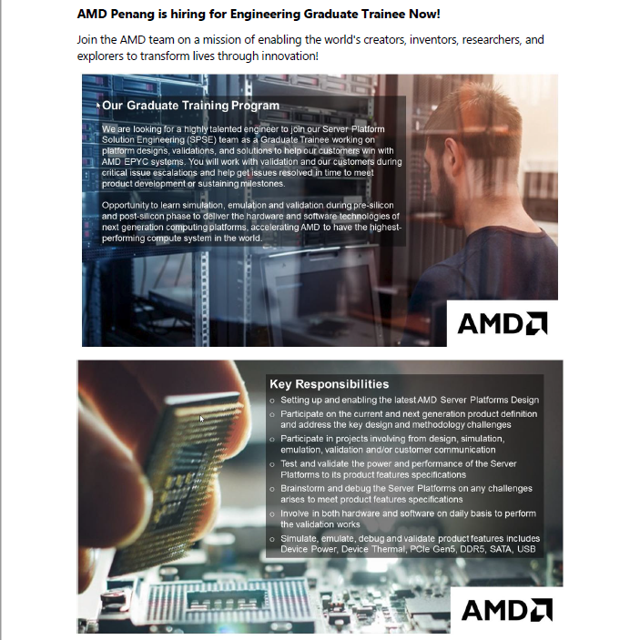 Greetings from AMD! We’re hiring R&D Engineering Graduate Trainees across multiple departments to expand our team in Malaysia, Penang.