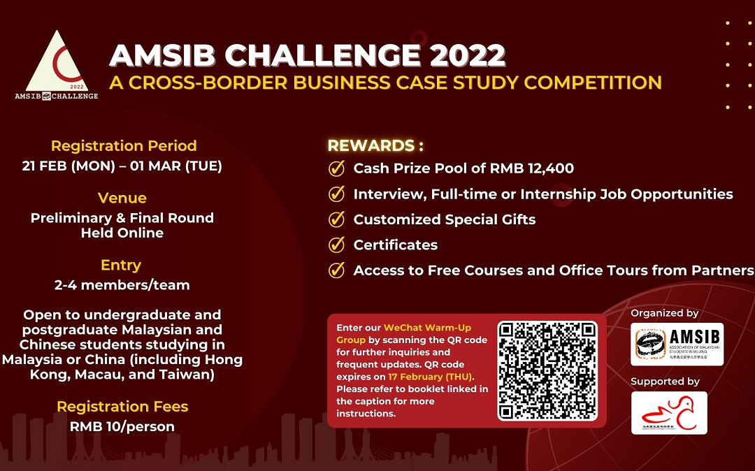 Look no further! AMSIB Challenge 2022 can make your dreams come true. Get to know more information through our basic information poster, AMSIB Challenge 2022 Competition Booklet and enter our WeChat Warm-Up group now by scanning our QR code to make further inquiries! QR code expires on 17 Feb (THU).