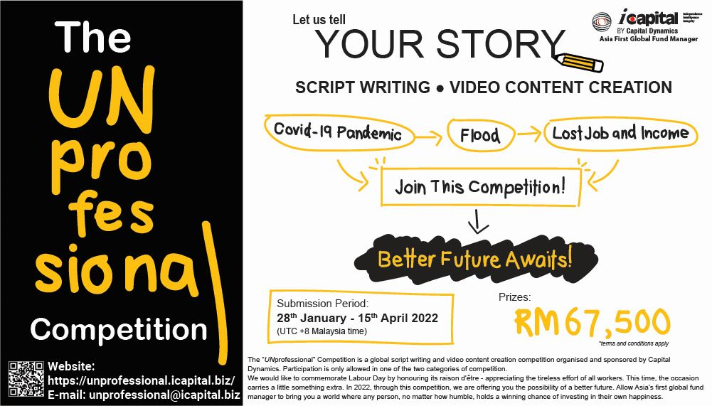 The UNprofessional Competition is a global script writing and video content creation competition organised and sponsored by Capital Dynamics to commemorate Labour Day 2022 by honouring its raison d’être - appreciating the tireless effort of all workers. The Covid-19 pandemic is a global crisis that has severely affected people from all walks of life. Businesses have been upended, workers have lost jobs, people have suffered loss of health and well-being. In these challenging times, Labour Day 2022 holds special significance, amidst our individual battles to survive the Covid-19 pandemic.
