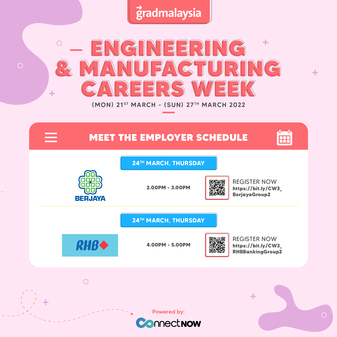 Our gradmalaysia Engineering & Manufacturing Careers Week is here! From the 21st to the 27th of March, you are invited to join us as esteemed employers and recruiters from reputable companies in Malaysia who are sharing useful advice and job opportunities in the engineering and manufacturing fields.