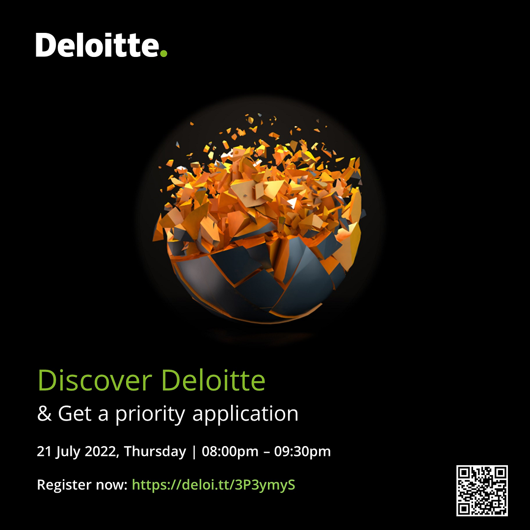 Calling all technology enthusiast students in Malaysia! Join us and discover your career journey as Deloitte Consulting Technology Analyst on 21 July 2022, 8:00pm – 9:30pm (GMT+8)