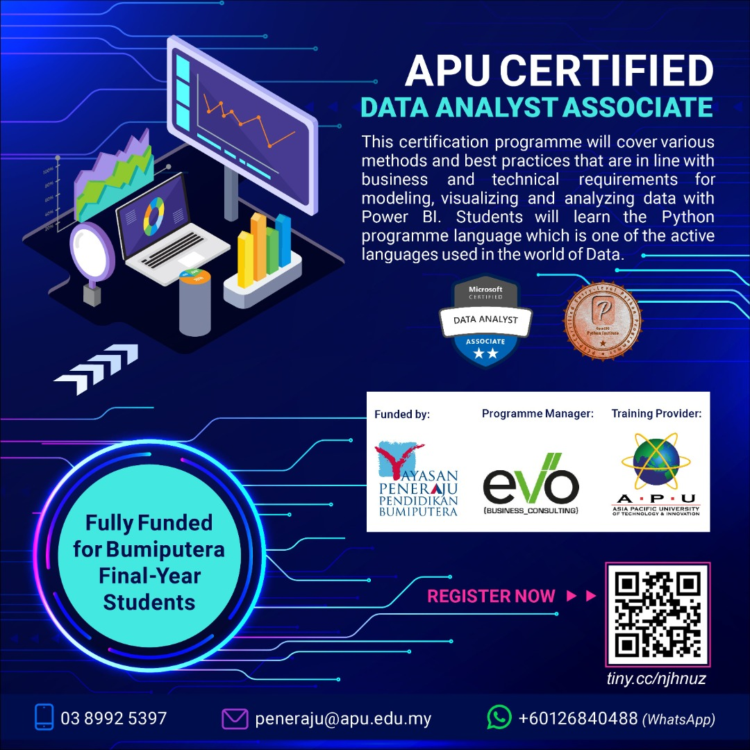 Yayasan Peneraju Pendidikan Bumiputera is offering funding opportunity for final year Degree students to pursue one of the certification listed below. The training for each certification will be conducted fully online on a part-time basis for about 2-3 months, after class/working hours. This programme aims to increase the number of Bumiputera students with industry certification in Technology. The programme will be fully-funded by Yayasan Peneraju Pendidikan Bumiputera.