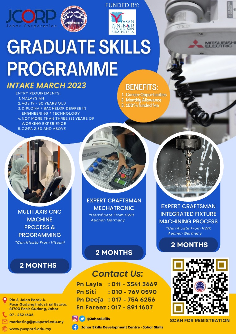 Johor Skills sedang mengadakan ambilan bagi Program Latihan Untuk Siswazah (PLUS) khususnya kepada lepasan siswazah / alumni dari Fakulti Kejuruteraan Mekanikal, Elektrik & Elektronik dan Mekatronik yang masih belum bekerja.