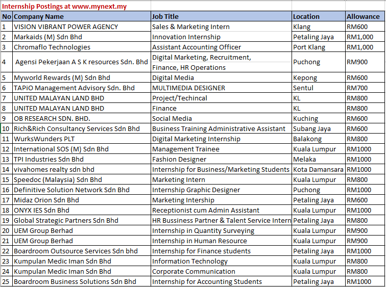 Some of the internships available can discover more in mynext platform (https://www.mynext.my/).